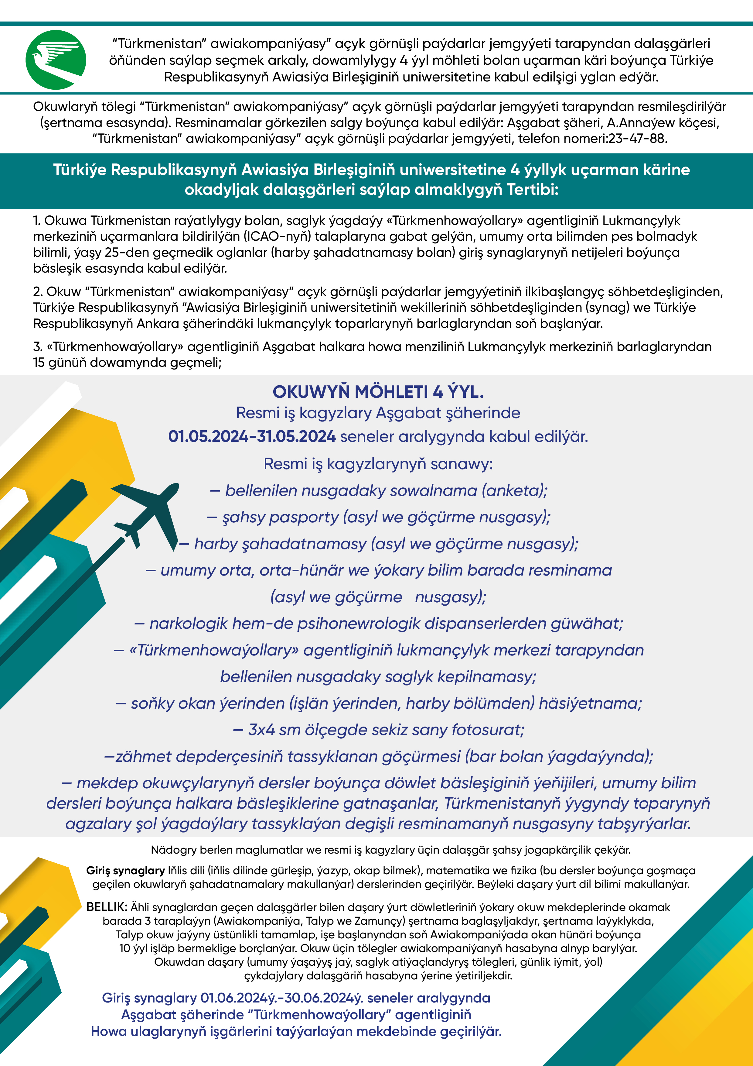 Admission exams are held at the aviation personnel training school of the Turkmenhovayollary Agency in the Ashgabat city at the period from 06/01/2024 to 30.06.2024.